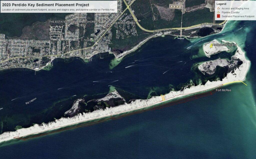 According to NPS, sediment placement on Perdido Key is expected to offset shoreline erosion, restore sediment to the natural sediment transport system, and create additional wildlife habitat.