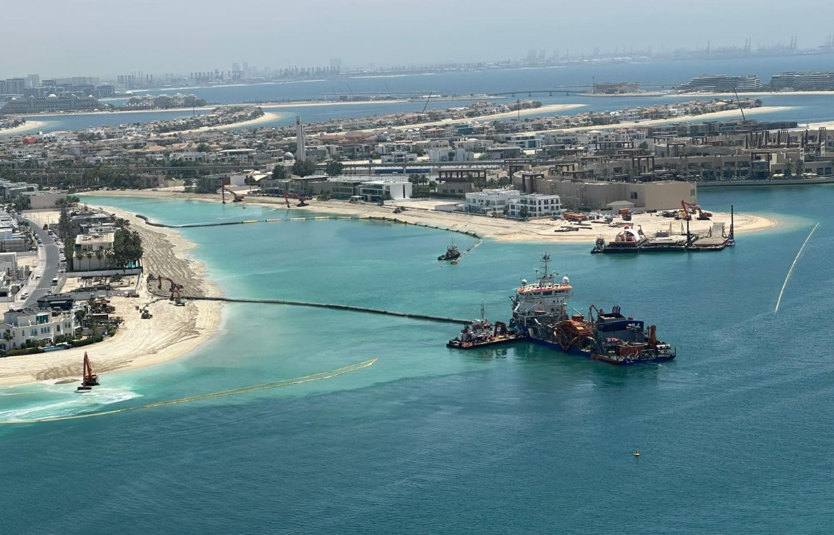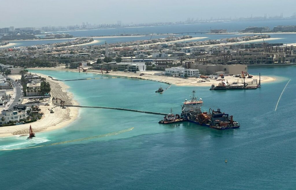Project developer Nakheel contracted Van Oord to raise and shape the beaches on the Palm over a length of 55 kilometres by half a metre and to create three shore protection structures, so called groynes, to reduce erosion.