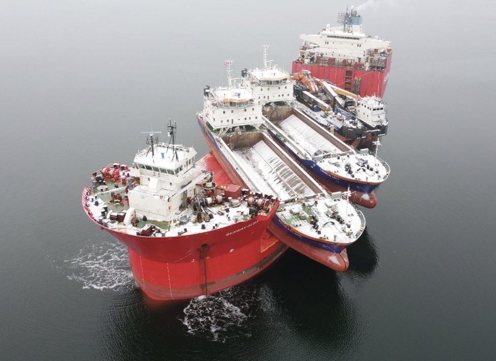 Semi-submersible vessel Seaway Albatross is on its journey to Bulgaria to deliver two Van Oord split hopper barges, the Pieter Caland and the Cornelis Lely, and backhoe dredger Simson.