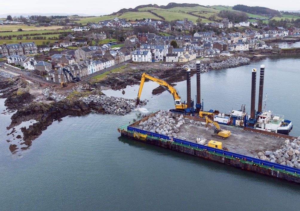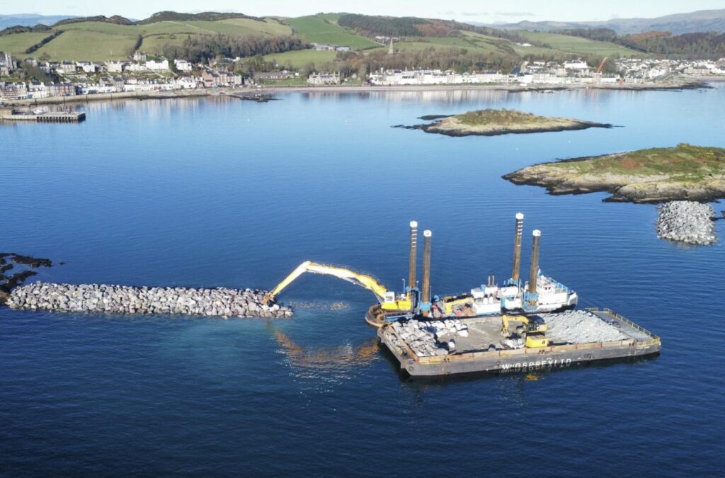 Construction works on the £48 million Millport Flood Protection Scheme, on the Isle of Cumbrae, started last spring and work is progressing well to build an offshore breakwater, which will create a calm area of water.