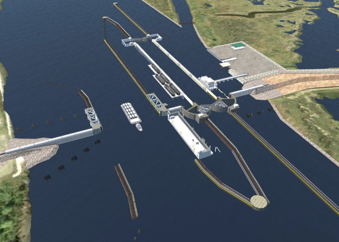 Once constructed, the HNC Lock Complex will span 110 feet across and stand 800 feet high with gates on either side, directly adjacent to the existing 250-foot-wide Bubba Dove barge floodgate.