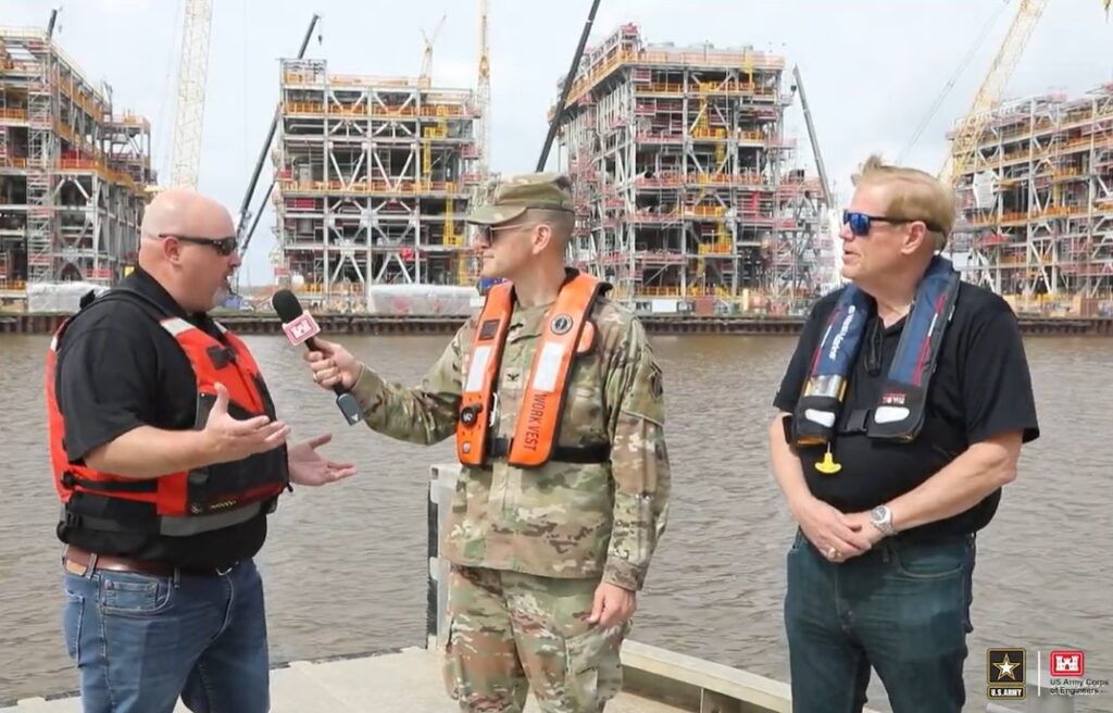 In the video, Col. Cullen Jones, commander, New Orleans District, Michael Stack, Operations Division chief and Mac Wade, executive director, Port of Morgan City, are discussing dredging progress to maintain deep draft access to the port: