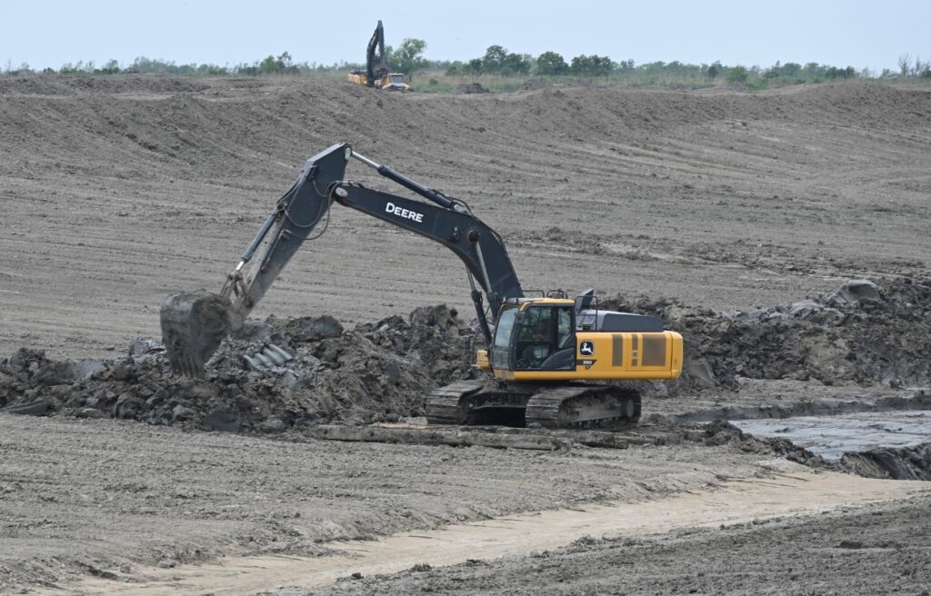 USACE workers and their construction partners are placing embankment material at the site of the levee construction, slowly building up layers of soil and material for the levee.