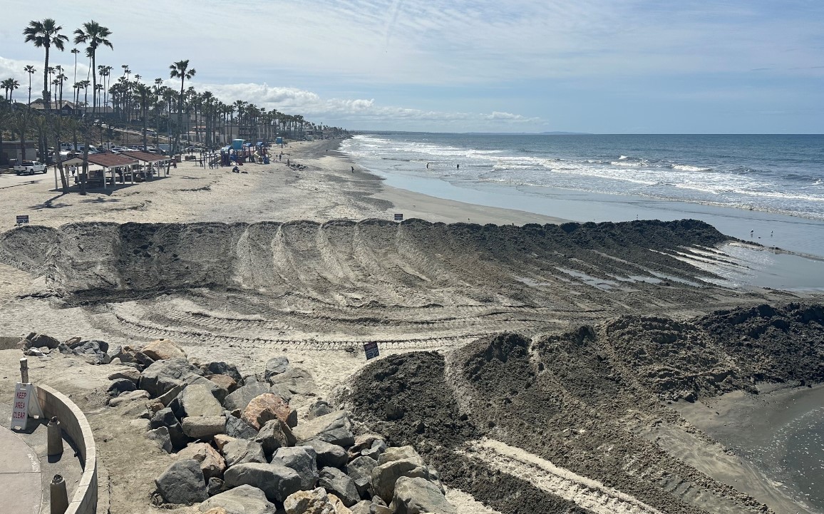 The sand dredged by the Army Corps of Engineers from the Harbor inlet is pumped onto Oceanside beaches.