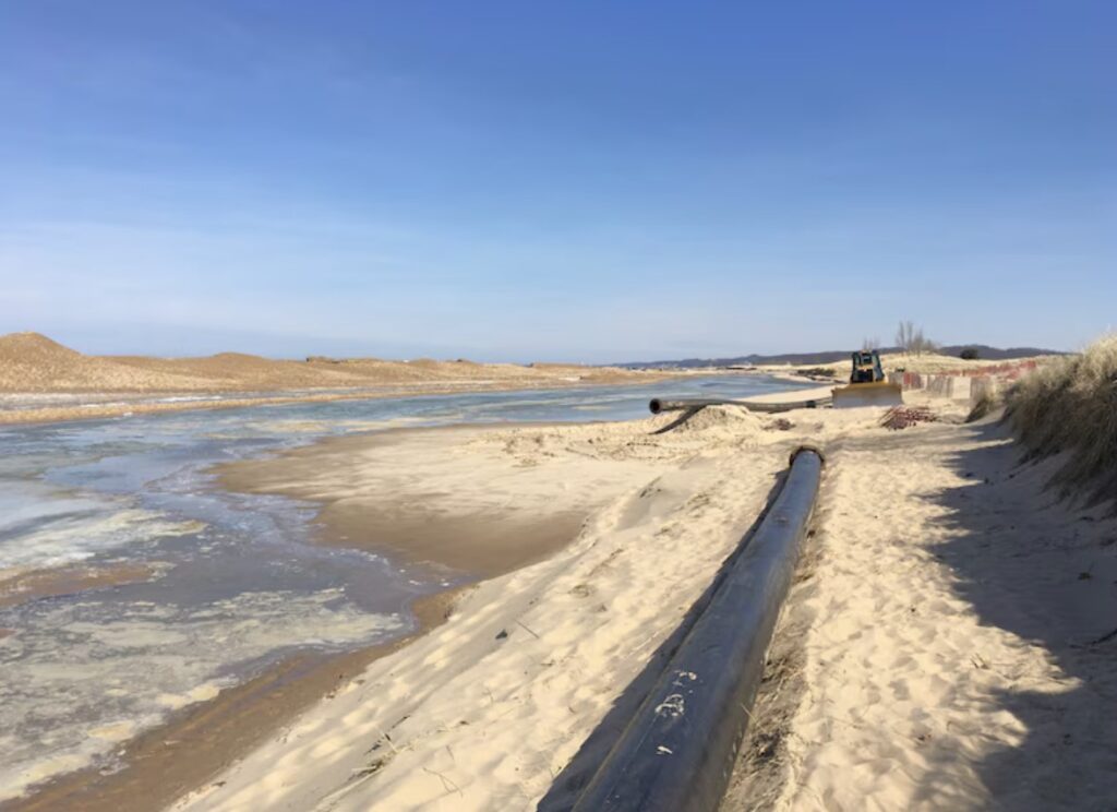 This project is a great example of using a maintenance dredging as a vehicle to combat erosion and provide multiple positive outcomes for the community in Saugatuck,” said Liz Newell Wilkinson, operations manager at the Grand Haven Office of the U.S. Army Corps of Engineers, Detroit District. “We have worked with the state of Michigan to ensure this sediment is environmentally safe to nourish the Lake Michigan shoreline.”