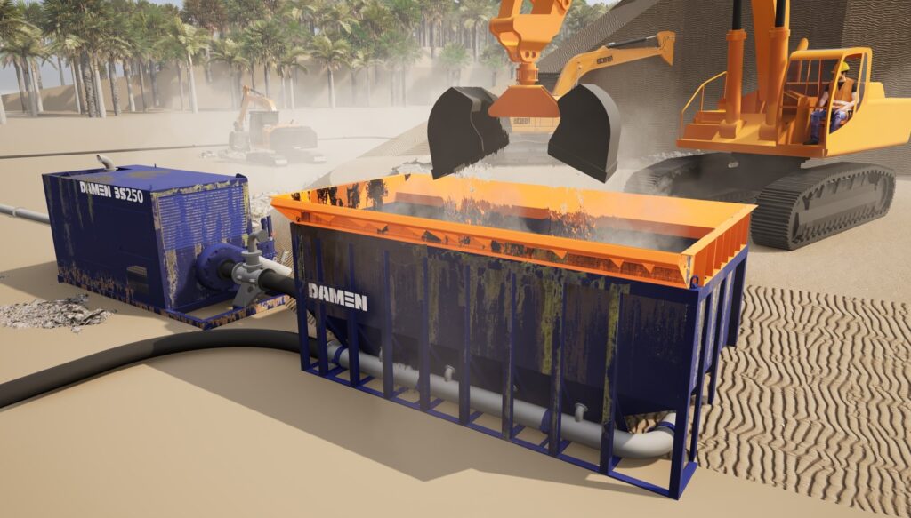 A practical plug ‘n play design which can be relocated easy and consists of elements that can all be used on the next dredging project. This makes the Soil Pumping Station the essential equipment linking dry excavation with the continuous process of a dredge pump.