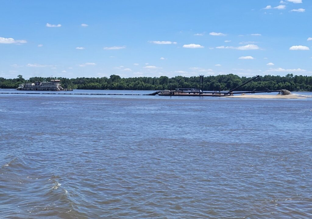 The U.S. Army Corps of Engineers, St. Louis District’s Dredge Potter is currently working near Grafton, Illinois, between river miles 218 and 222, using a 300-foot-long flexible floating pipeline to remove material from the navigation channel.