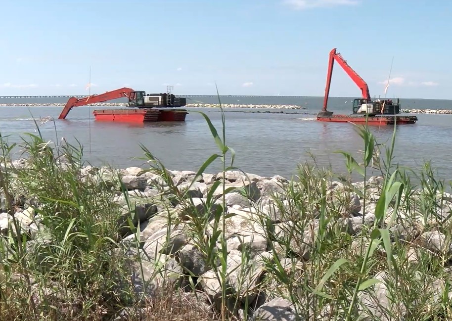 During the month of July, approximately 20 acres of intertidal marsh is being created by dredging material via a submerged pipeline from a borrow site three miles from the project site.