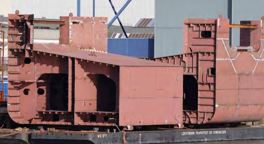 The two sections (seen in the photo) with also the bottom dump doors were spotted when they were transported by using the Lekstroom Transport coupled barges.