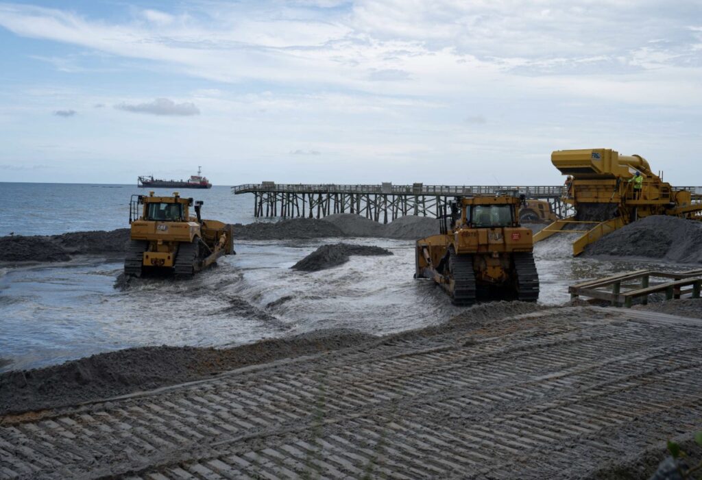 The equipment needs to be moved back around the Pier to its south as they have officially finished dredging and pumping sand,” said County Coastal Engineering Administrator Ansley Wren-Key. “The Army Corps and Weeks Marine did a great job for us.”