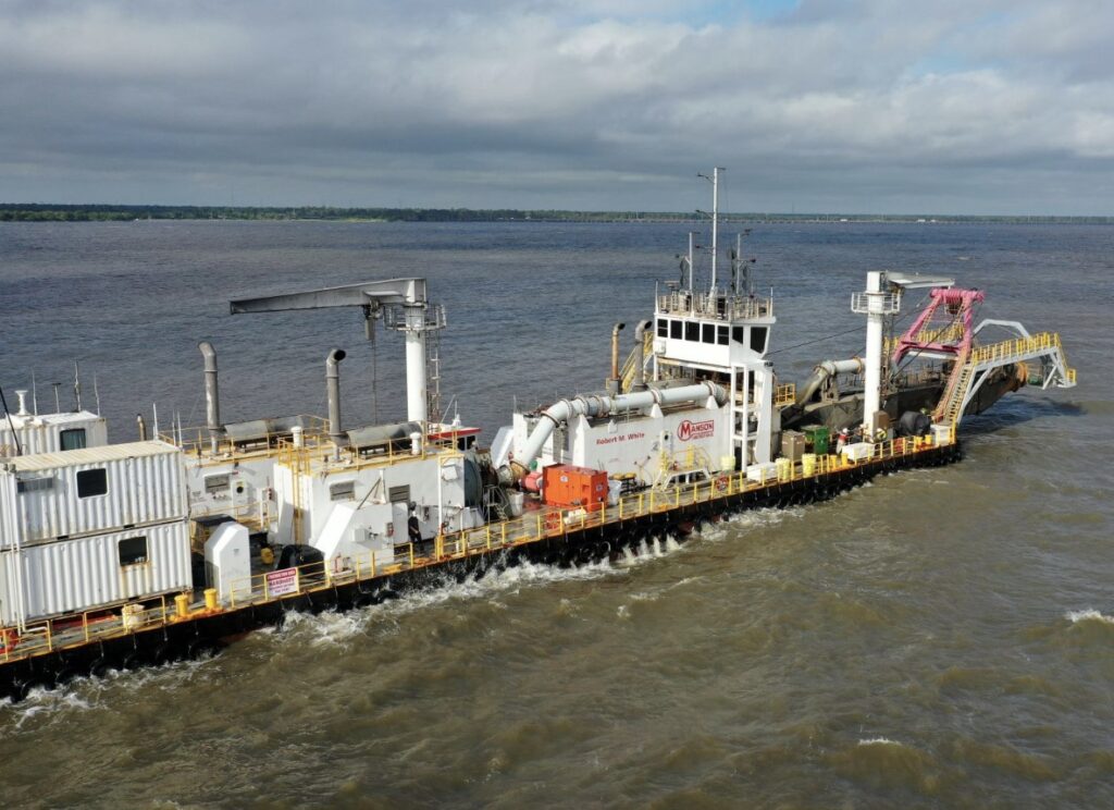 The 270-feet long dredge, capable of pumping 60,000 cubic-yards of fill material a day, is being used to rebuild the LaBranche Marsh.
