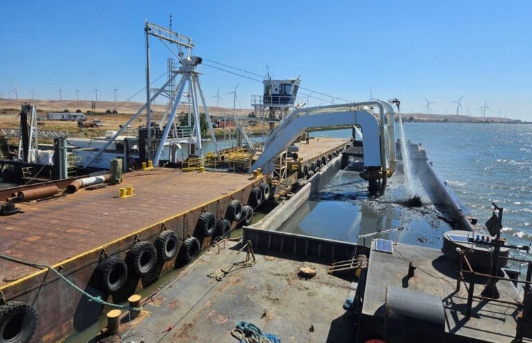 The dredged sediment, which is collected by Dutra’s Derrick Barge 24, is taken to the Montezuma Wetlands and offloaded using the Liberty Offloader for beneficial reuse.