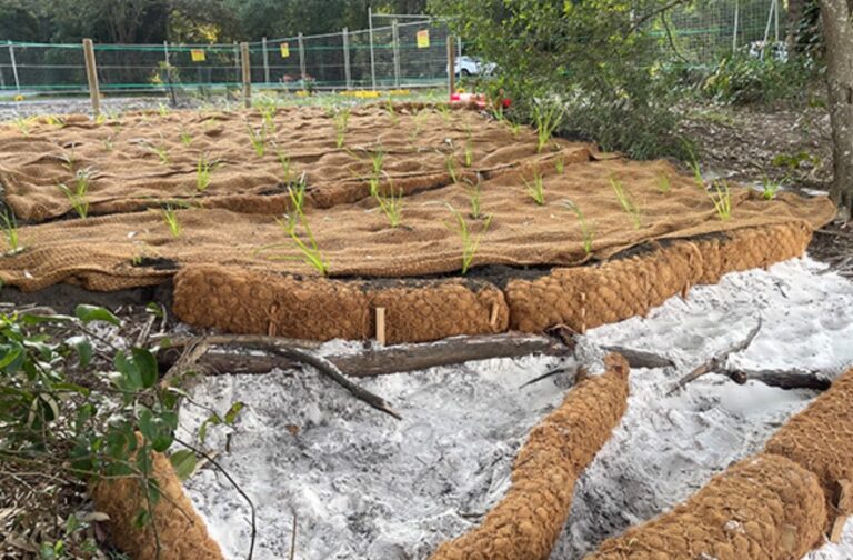 Once the eroded area was filled and compacted, it was top-dressed and stabilized using natural coir mesh.