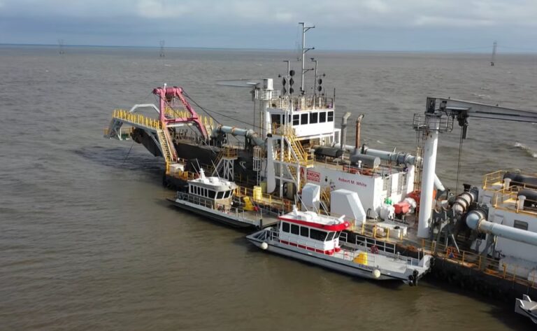 The Robert M. White is a 270ft dredge with a 30 inch output pipe. It will be dredging borrow material to fill the containment dikes, for rebuilding invaluable estuarian marsh.