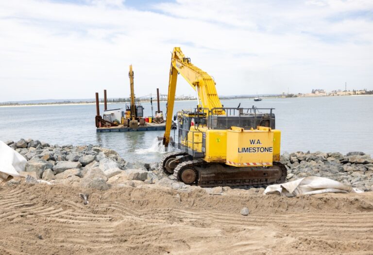 A joint venture between Western Australian companies WA Limestone Contracting and Italia Stone Group was awarded the contract for the $69.2 million breakwater works in July. Dredging to remove soft sediment from the construction footprint started last month.