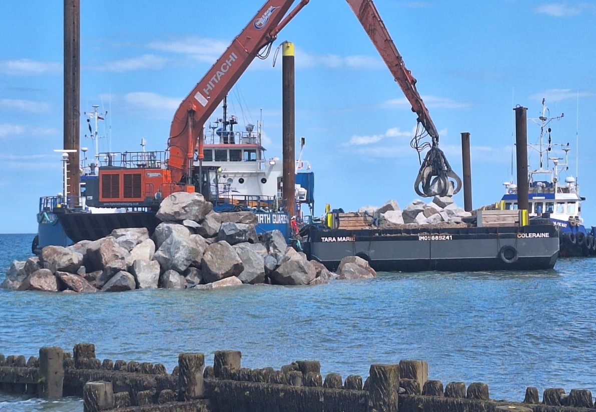 Our team at Foyle & Marine Dredging utilized two tugs and two barges to transfer rock from the delivery vessel to shore, even when faced with challenging weather conditions,” said Foyle & Marine.