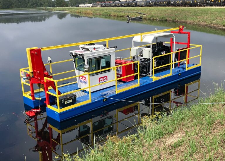 The system boasts a powerful 125 HP (93 kW) diesel engine, 2,000 GPM (454m3/hr.) dredge pump, and a powerful cutterhead with the patented Pump Defender for reducing downtime in debris rich environments by up to 80%,” Mud Cat said.