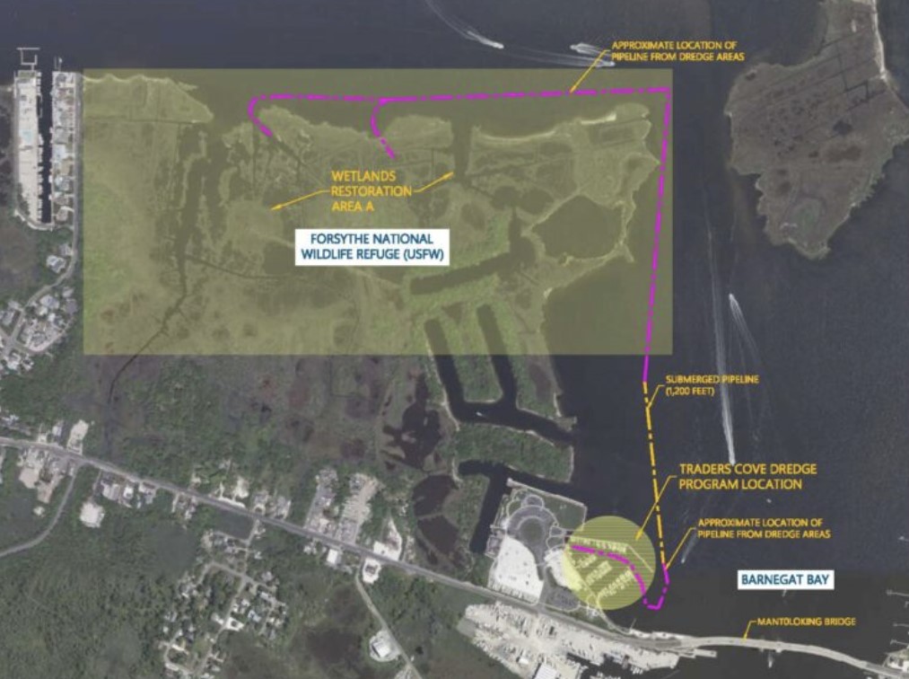 The dredged material will then be repurposed for marsh restoration and ecological enhancement at the adjacent Forsythe National Wildlife Refuge, making this effort both a practical and environmentally beneficial undertaking.