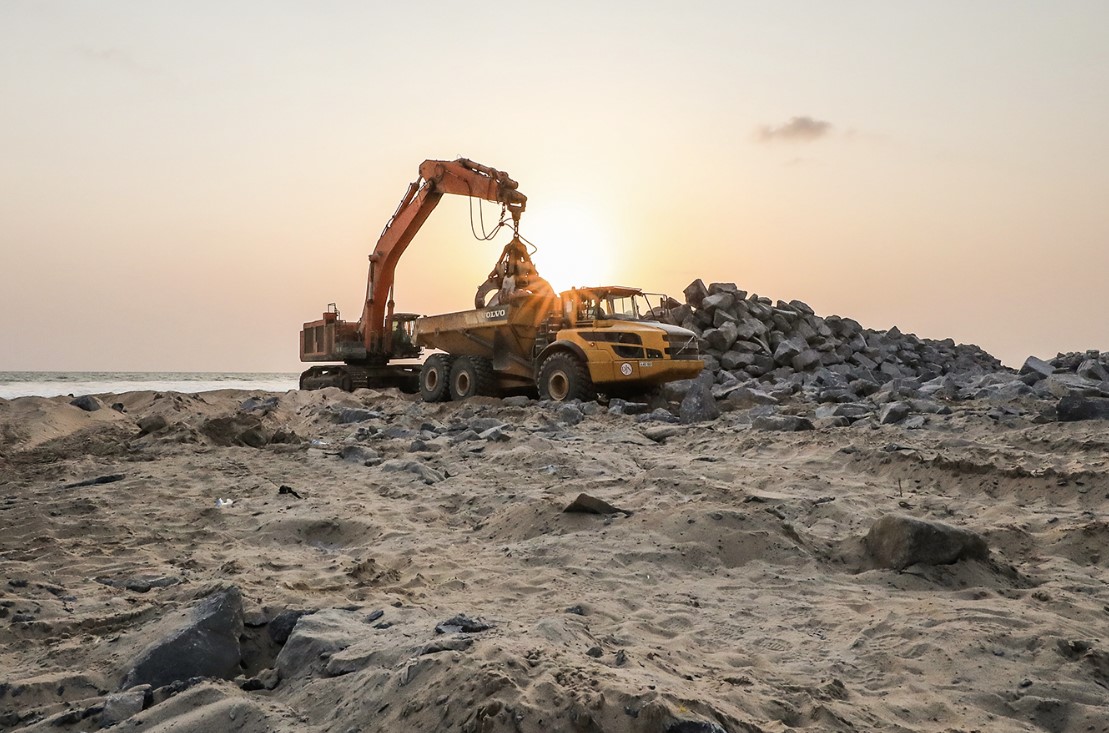 Starting in November 2018, 2 km of breakwater were installed in the first season. In the second season, the breakwater was extended westwards by another 2 km. The third season, completed in April 2021, saw 5.2 km of breakwater installed.