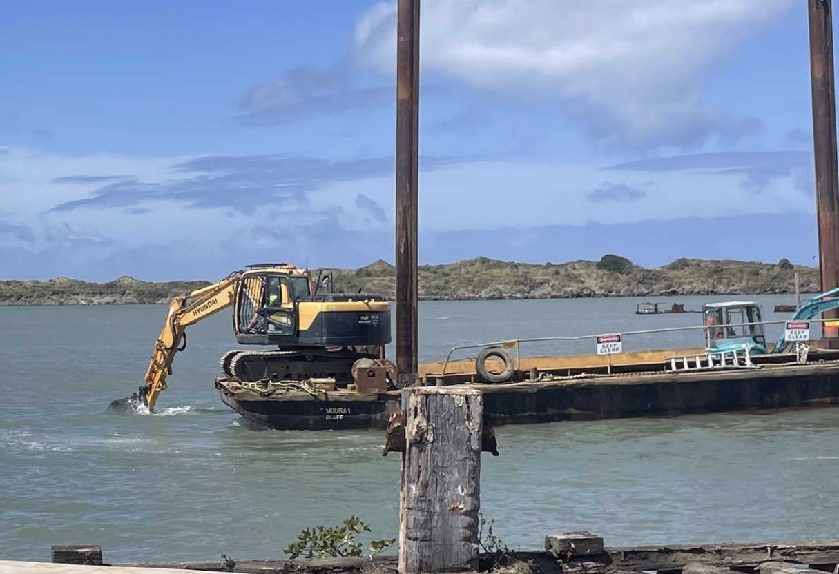 The current dredging operation is being done by an excavator and barge, with collected spoil released back into the channel downstream of the Whanganui Port.