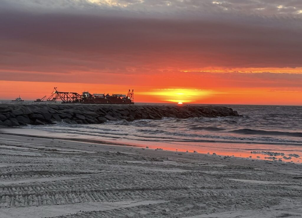 Sand for the project is coming from two designated borrow areas – one located within Absecon Inlet and the other in the Atlantic Ocean offshore of the island.