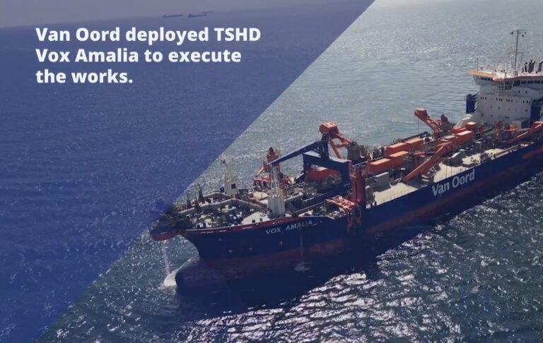After the structures were in place, trailing suction hopper dredger Vox Amalia deposited 4 million cubic meters of sand to protect the stretch of coastline from erosion.