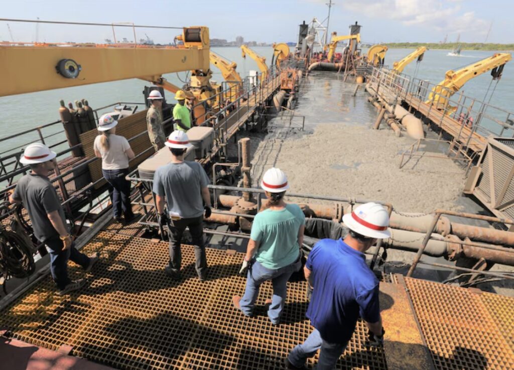 How much dredging, to be exact? Every year, the Galveston District dredges anywhere between 30 to 40 million cubic yards of sand. All that comes from the harbor and channel dredging of Texas’ biggest ports, including Beaumont, Corpus Christi, Matagorda, and Houston.