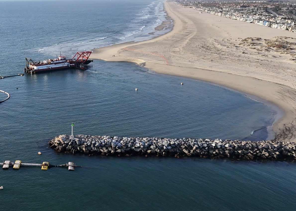 The dredged sand was pumped from the harbor down to the beach at Port Hueneme, which erodes over time due to normal sand migration along the coast.