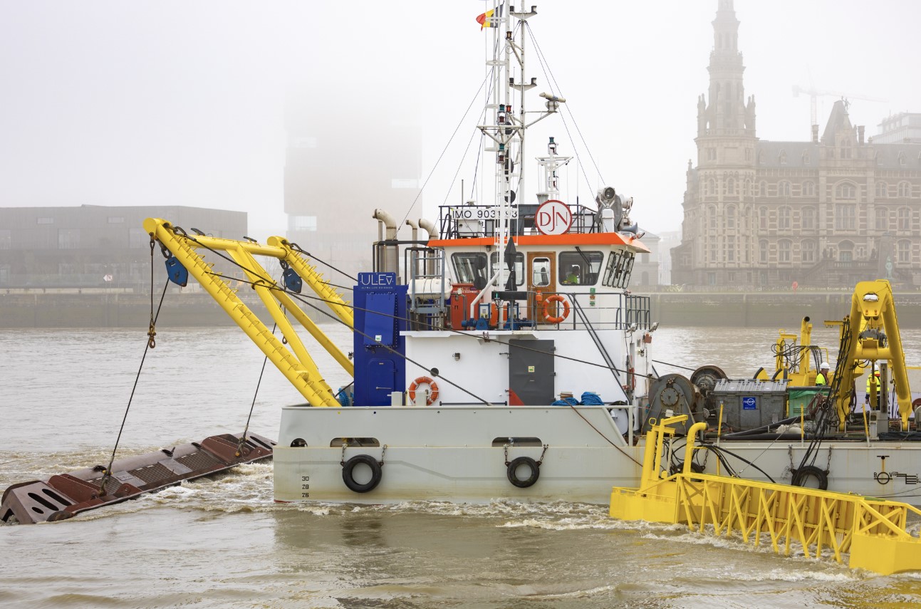 The vessel Pieter Coecke is active in the river Scheldt and the Port of Antwerp, sweep dredging and clearing debris and oil.