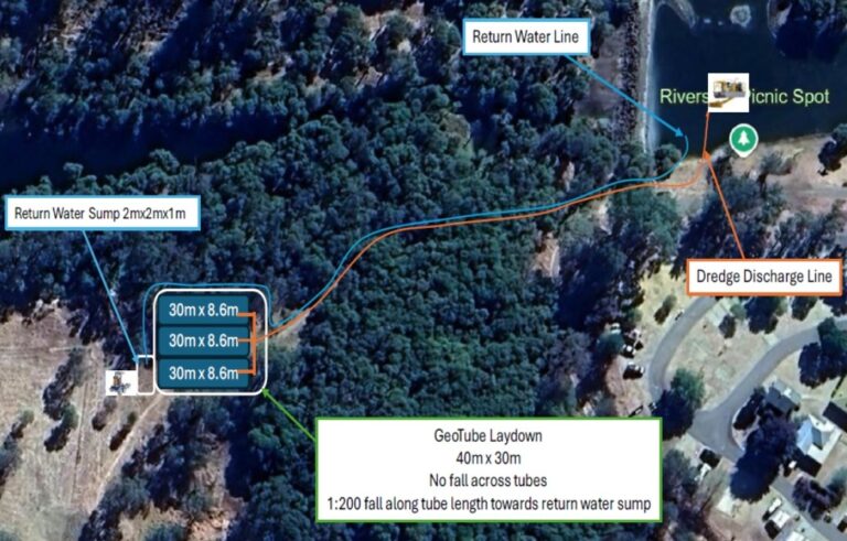A laydown area will be set up at the overflow camping ground reserve on Pollard Street, where dredged sediment will be pumped for drying and treatment.