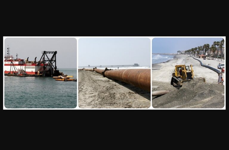 A dredging vessel in the Harbor inlet will pump the sand through a pipe, which will be used to replenish the sand on Oceanside beaches.