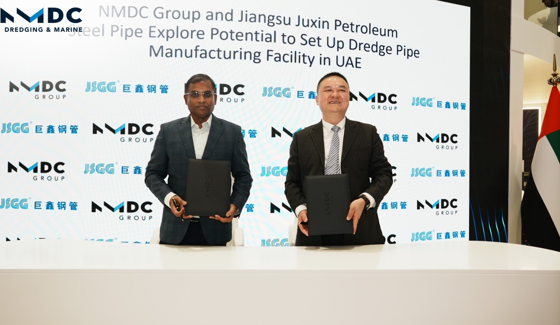 NMDC Group has signed an Memorandum of Understanding (MoU) with Jiangsu Juxin Petroleum Steel Pipe, to explore areas of collaboration, with the long-term aim to establish fabrication facilities in the UAE for metallic pipes to be primarily used in the dredging sector.