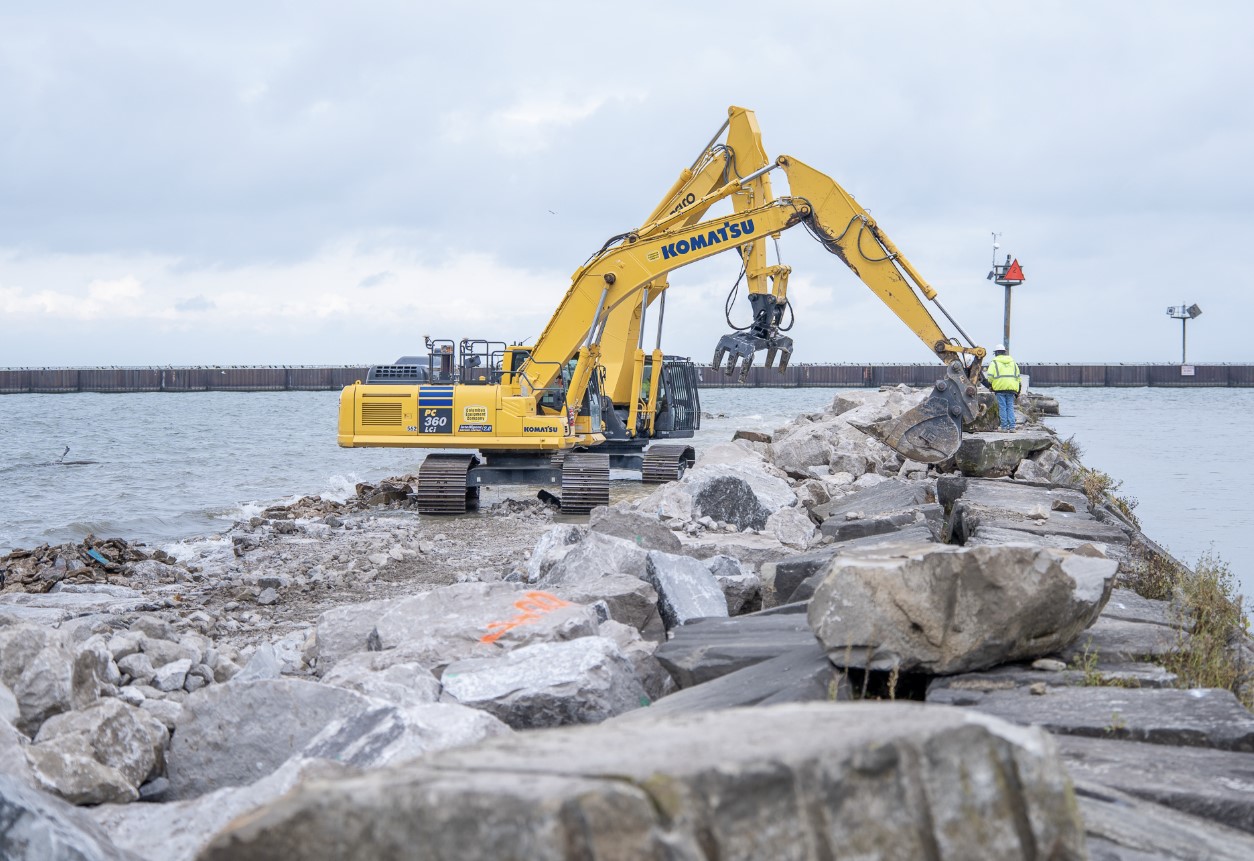 A repair to 200 feet of the northern end of the East Pier was completed in 2021 with more than 2,000 tons of stone and concrete installed.