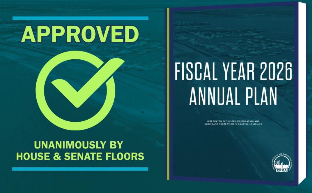 The Louisiana Legislature has unanimously adopted the Coastal Protection and Restoration Authority’s (CPRA) Fiscal Year 2026 Annual Plan, advancing a record-breaking $1.98 billion investment in coastal restoration and protection – the largest single-year investment in the program’s history.