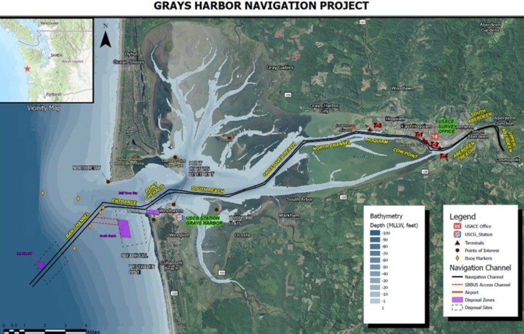 According to USACE, dredging operations are expected to start in Aberdeen Reach, and occur in the shoaled areas of Aberdeen Reach, Cow Point and Turning Basin, Hoquiam Reach, North Channel, and Crossover Channel.