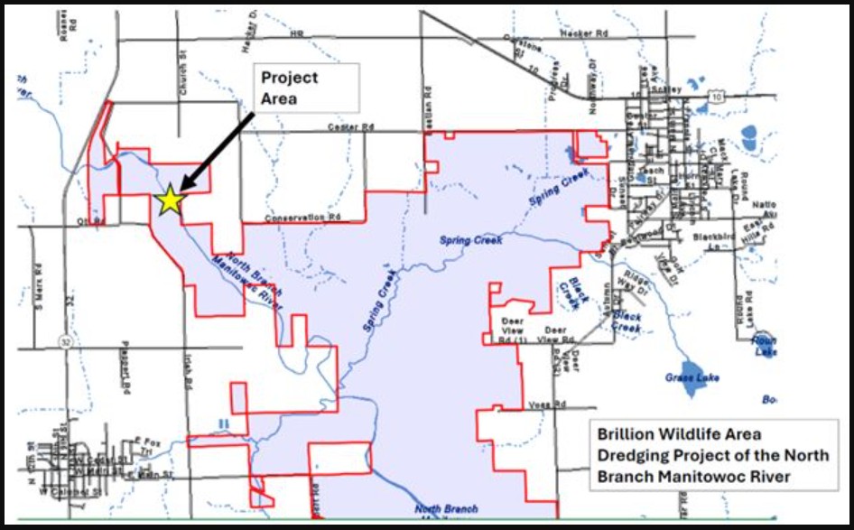 The Evers Administration (Wisconsin) is embarking on a wetland project through the Wisconsin Department of Natural Resources (DNR), together with the help of Ducks Unlimited, on the North Branch of the Manitowoc River on the northwest side of the Brillion State Wildlife Area in Calumet County.