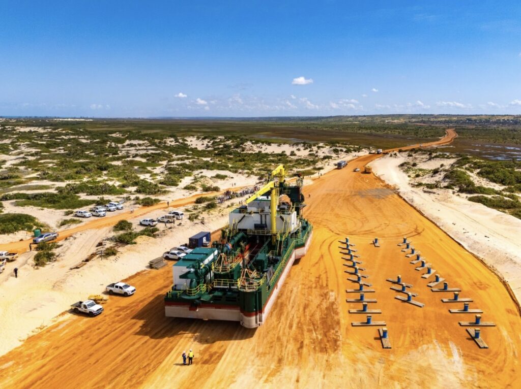 The first of Kenmare’s two new high-capacity dredges has landed safely on the beach near Moma Mine.