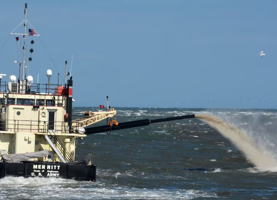 The sidecast dredge does not have the capability to place dredged material on the beach or in upland disposal sites, but rather ‘sprays’ the shoal material approximately 100 – 150 foot to the port or starboard side of the vessel and away from the channel,” Carteret County said.