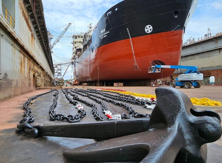 The USACE New Orleans District said that the anchor and anchor chains of the hopper dredger Wheeler received a new coat of paint after regular inspections while in drydock at the Alabama Shipyard earlier this week.