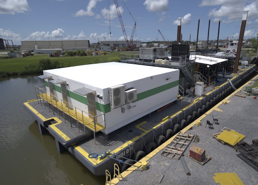 The custom structure, measuring 36 ft wide by 32 ft long by 12 ft high, was installed as a single-lift module on a customer-supplied 180 ft by 55 ft barge.