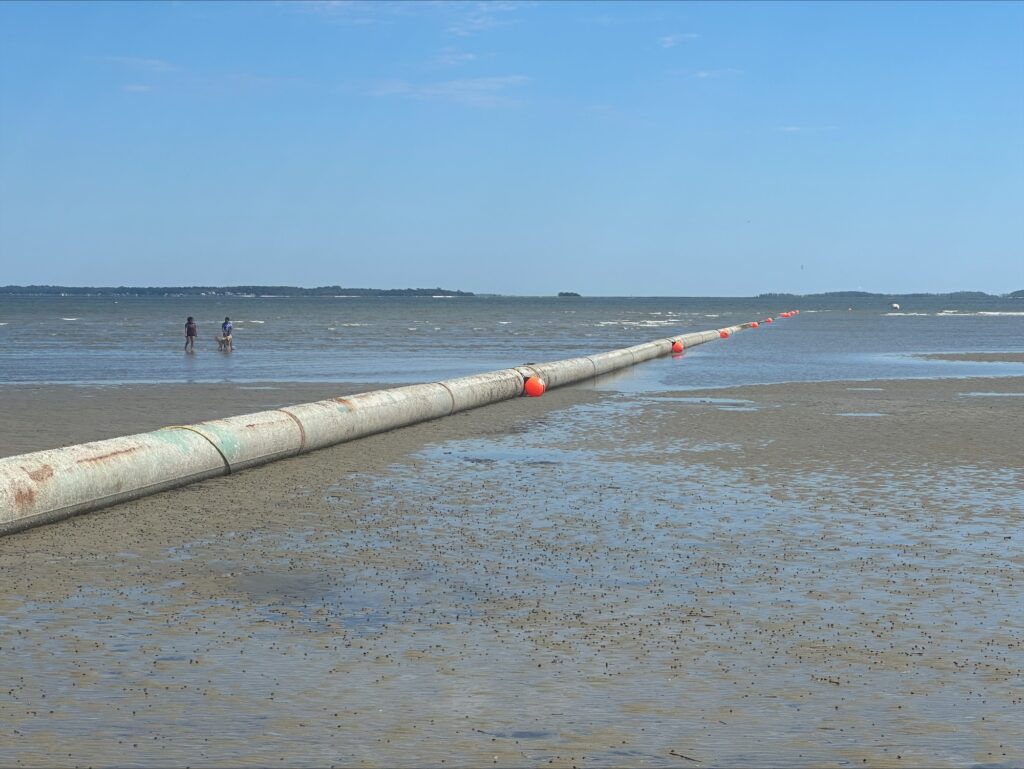 In total, about 20,000 feet of pipe—stretching nearly four miles—will be used to transport sand from Bay Point Shoals to the shoreline at Fish Haul Creek.