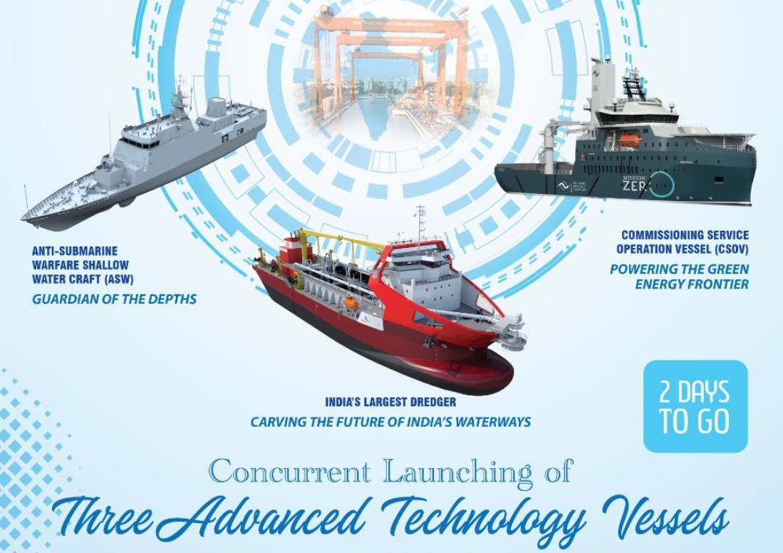 The Cochin Shipyard will launch three vessels tomorrow. According to the Shipyard, each vessel addresses a strategic national need and illustrates India’s expanding maritime capability, from defense and port infrastructure to green energy and sustainability.