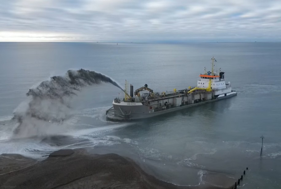 According to the latest update, Boskalis’ dredger Sospan Dau delivered two loads during each high tide (both day and night), extracting material from the entrance of Chichester Harbor and depositing it ashore to improve the beach levels.