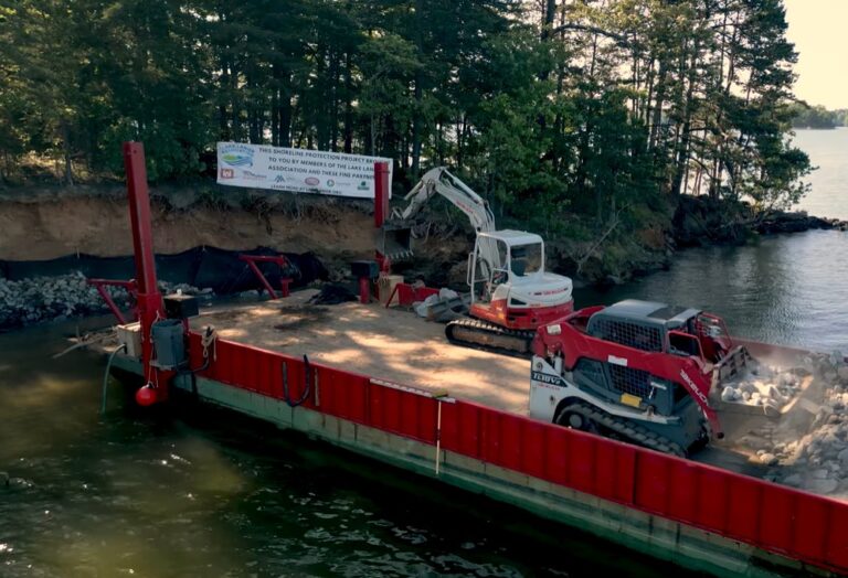 According to LLA, this shoreline protection project was made possible by the members of the Lake Lanier Association and in partnership with the U.S. Army Corps of Engineers, Lake Sidney Lanier, Marine Specialties, Martin Marietta, Simpson Trucking And Grading, Inc., Gwinnett County Government Water Resources, Forsyth County Georgia Government and Hall County Government.