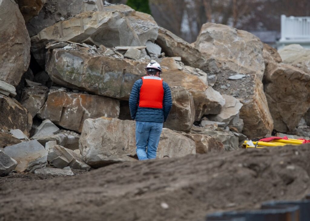 The U.S. Army Corps of Engineers, Buffalo District, said the the crews are currently laying cut stone on top of the gravel that was added after all the steel sheet piling was placed.