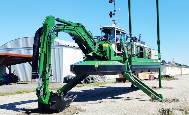 Watermaster is easy to transport between sites, amphibious, and able to work in challenging shallow water conditions. It can independently carry out maintenance tasks such as desilting by suction dredging and backhoe dredging, and vegetation removal by raking – all with one machine,” Watermaster / Aquamec Ltd. said.