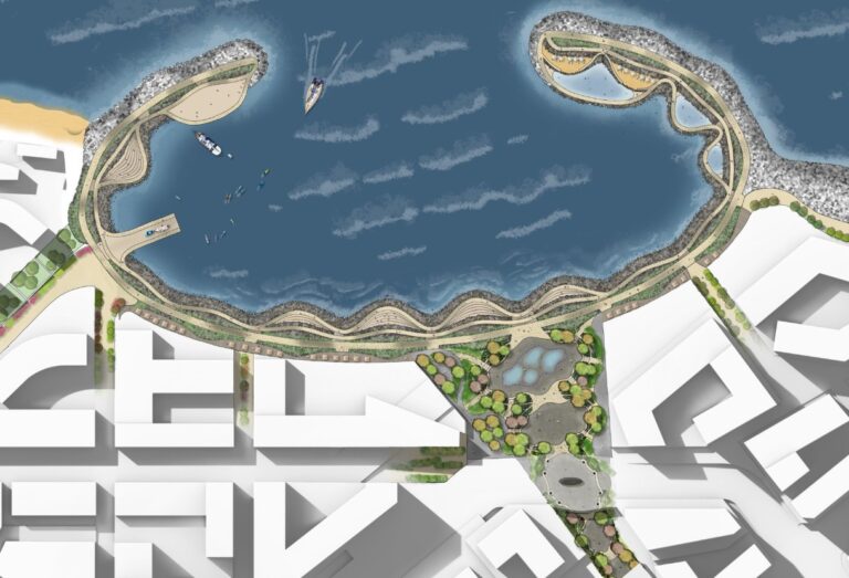 New public amenities will include the new bay, providing sheltered waters for boating, kayaking, and swimming.