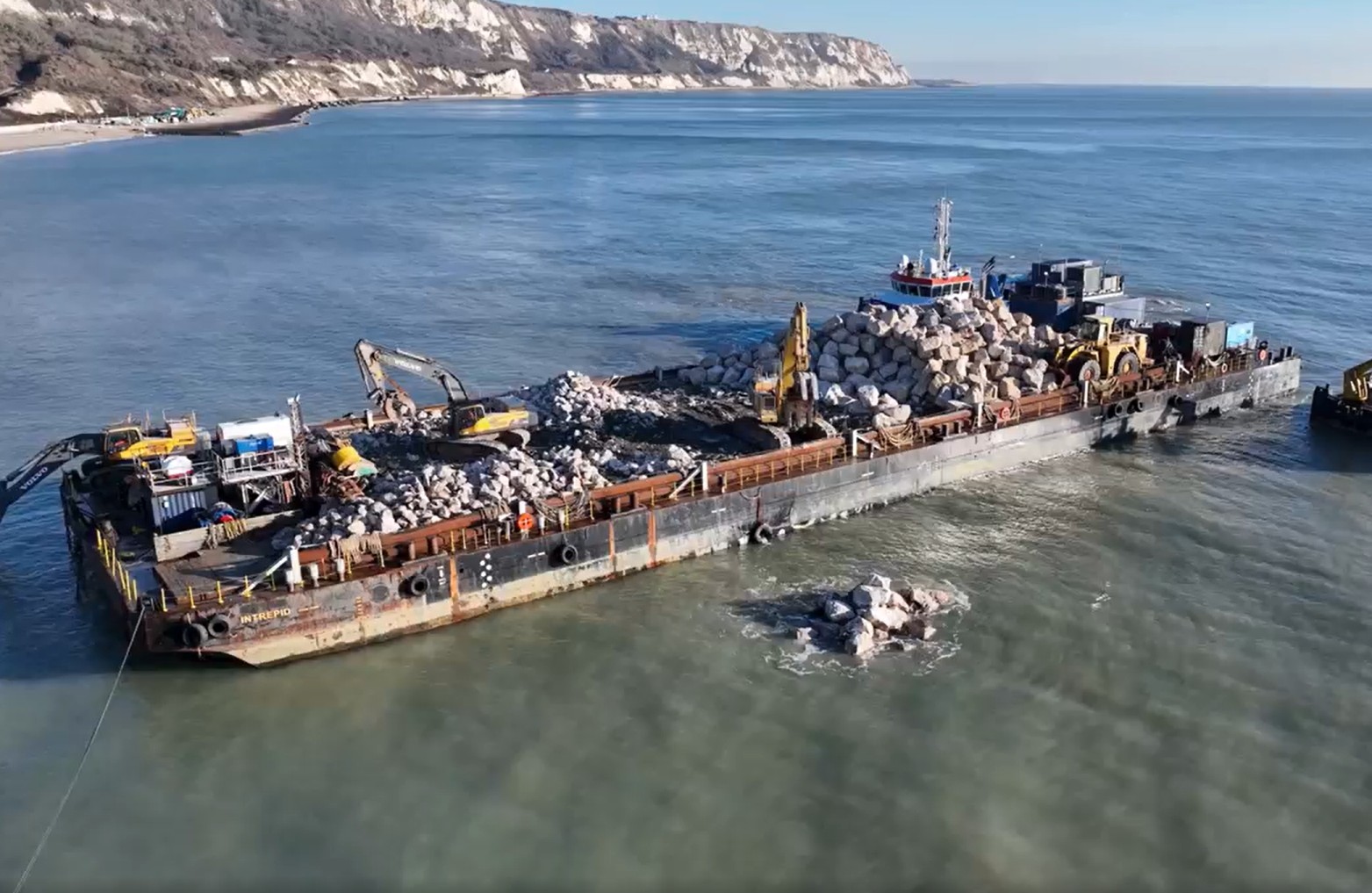 The VolkerStevin team working on the Folkestone Warren Sea Defenses project, supporting VolkerFitzpatrick as part of Southern Renewals Enterprise (SRE), has executed the recovery of four barges of limestone, transported from the Port of Boulogne, and delivered to the intertidal drop zone on the beach at Folkestone Warren.