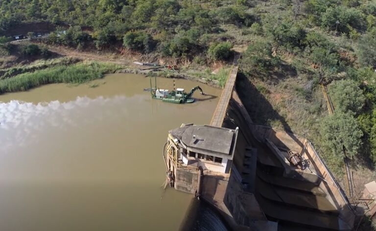 A Watermaster amphibious dredger is restoring lost capacity in a shallow and hard-to-reach reservoir where larger conventional equipment cannot operate.