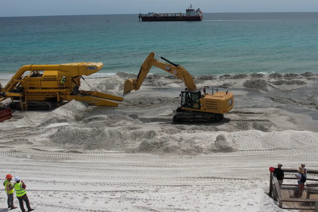 This work, conducted by Great Lakes Dredge and Dock Company (GLDD), encompasses two areas of west Destin beaches, located between the South Bay by the Gulf Condos and the jetty, with a small gap separating the two areas.